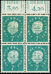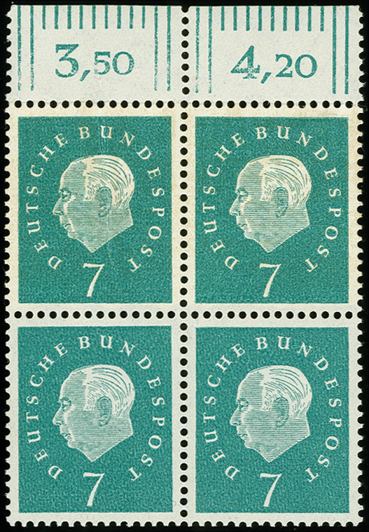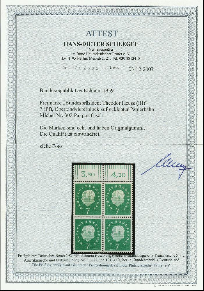 | Zusatzinformationen und Suchstichworte: | 367. Auktion Heinrich Köhler 25. - 29. September 2018 Los 2412 1959, Heuss III 7 Pfg. im Oberrandviererblock, die beiden oberen Marken mit Abart "Druck auf geklebter Papierbahn", postfrisch, tadellos, Fotoattest D. Schlegel BPP (2007) Zuschlag 480,00 EUR |
