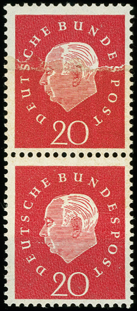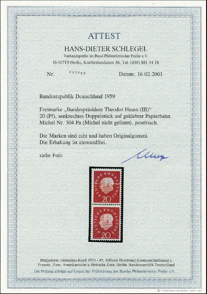 | Zusatzinformationen und Suchstichworte: | 367. Auktion Heinrich Köhler 25. - 29. September 2018 Los 2413 20 Pfg. im senkrechten Paar, beide Werte mit Abart "Druck auf geklebter Papierbahn", postfrisch mit Gummiflecken, tadellos, selten, Fotoattest D. Schlegel BPP (2001) Zuschlag 200,00 EUR |