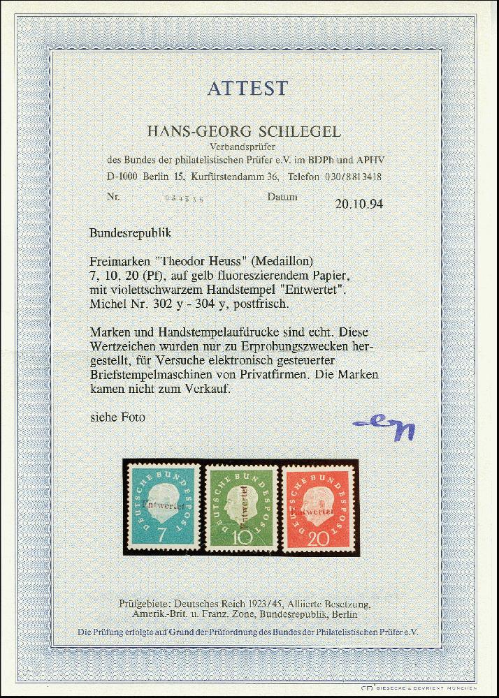 | Zusatzinformationen und Suchstichworte: | 367. Auktion Heinrich Köhler 25. - 29. September 2018 Los 2415 1959, Heuss III 7-20 Pfg. auf gelb fluorezierendem Papier und violettem Handstempel "Entwertet", postfrisch, tadellos, Fotoattest Schlegel BPP (1994) Ausruf 140,00 EUR |