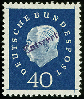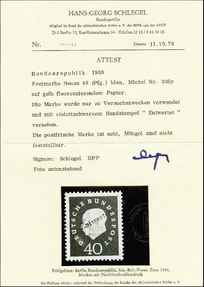 | Zusatzinformationen und Suchstichworte: | 367. Auktion Heinrich Köhler 25. - 29. September 2018 Los 2419 40 Pfg. auf gelb fluoreszierendem Papier mit Handstempel "Entwertet", postfrisch, tadellos, sign. Schlegel BPP mit Fotoattest (1976) (Mi. 2.000,-) Ausruf 300,00 EUR |