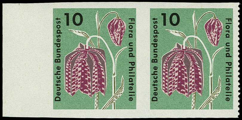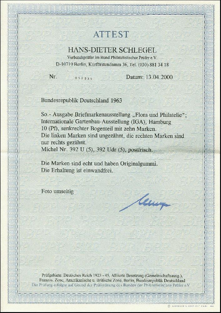 | Zusatzinformationen und Suchstichworte: | 367. Auktion Heinrich Köhler 25. - 29. September 2018 Los 2429 1963, Flora und Philatelie 10 Pfg. ungezähnt und 10 Pfg. nur rechts gezähnt im waagerechten Randpaar, postfrisch, tadellos, sehr selten, bisher nicht gelistet, Fotoattest D. Schlegel BPP (2000) für eine größere Einheit Zuschlag 1.250,00 EUR |