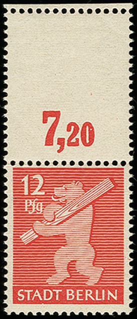 | Zusatzinformationen und Suchstichworte: | 368. Auktion Heinrich Köhler 26.-30. März 2019 Los 2371 12 Pfg. rot mit anhängendem gezähnten Randleerfeld in Markengröße vom Oberrand, postfrisch, leichte Gummischlieren mit winziger Haftstelle im Oberrand sind herstellungsbeding, sonst tadellos, Fotoattest Dr. Jasch BPP (2009) (Mi. 320,-) Ausruf 100,00 EUR |