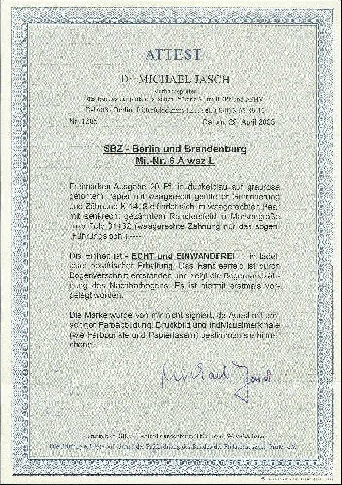 | Prüfer: | Jasch, Michael (BPP (Bund Philatelistischer Prüfer)) |