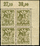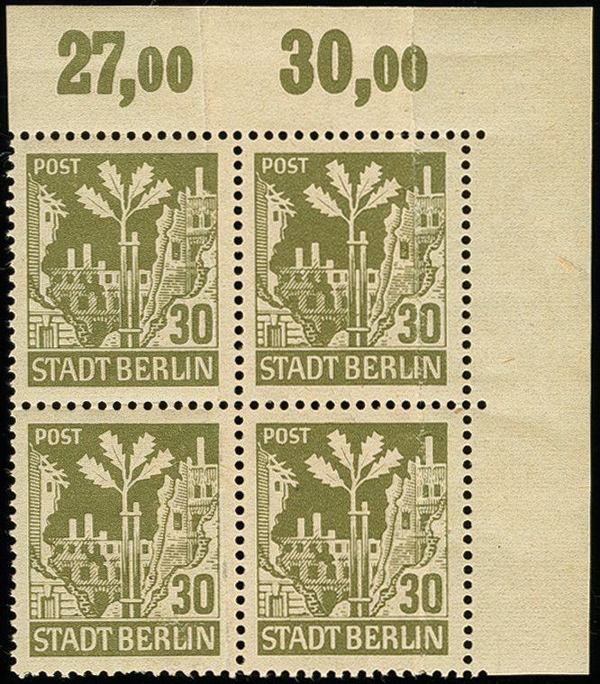 | Zusatzinformationen und Suchstichworte: | 368. Auktion Heinrich Köhler 26.-30. März 2019 Los 2373 30 Pfg. bräunlicholiv im Viererblock aus der rechten oberen Bogenecke mit Abart "Druck auf geklebter Papierbahn" auf allen vier Werten und Oberrand, postfrisch mit üblichen Klebehaftstellen, tadellos, sehr seltene Einheit, Fotoattest Ströh BPP (2001) (Mi. 2.200,-) Zuschlag 450,00 EUR |