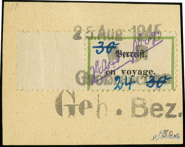 | Zusatzinformationen und Suchstichworte: | 368. Auktion Heinrich Köhler 26.-30. März 2019 Los 2277 Postzettel "Verreist - en voyage" 24 auf 30 Pfg., Randstück mit Notstempeltype "b" und Datums-L1 "25.Aug.1945" auf Briefstück, tadellos, sign. Sturm und Fotoattest Kunz BPP (2007) (Mi. 500,-) Zuschlag 160,00 EUR |