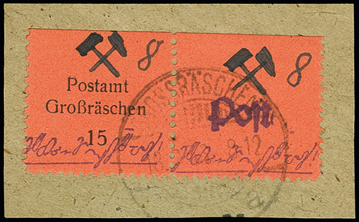 | Zusatzinformationen und Suchstichworte: | 368. Auktion Heinrich Köhler 26.-30. März 2019 Los 2281 1. Zwischenausgabe 8 Pfg. auf orangerot mit Eindruck "Postamt/Großräschen 15" und 8 Pfg. auf orangerot mit violettem Handstempel "Post" als waagerechtem Zusammendruck mit Stempel "GROSSRÄSCHEN 18.2.46" auf Briefstück, tadellos, sehr seltene Variante, eine der großen Lokalausgaben-Seltenheiten, sign. Sturm und Fotoattest Kunz BPP (2018) Zuschlag 1.800,00 EUR |