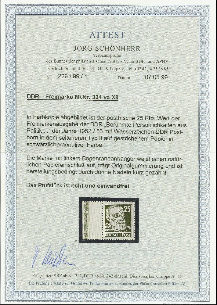 | Zusatzinformationen und Suchstichworte: | 368. Auktion Heinrich Köhler 26.-30. März 2019 Los 2570 25 Pfg. schwärzlichbraunoliv auf gestrichenem Papier mit Wasserzeichen 2 XII, Randstück, postfrisch, tadellos, unsigniert mit Fotoattest Paul BPP (1999) (Mi. 1.000,-) Zuschlag 190,00 EUR |