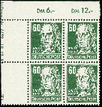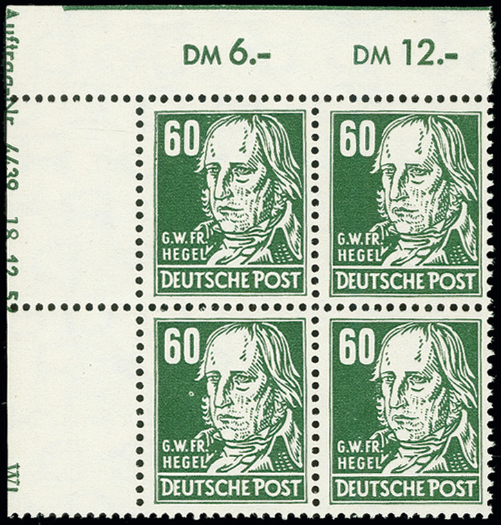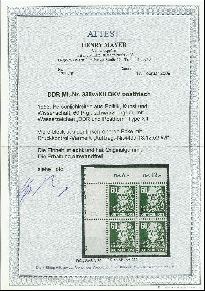 | Zusatzinformationen und Suchstichworte: | 368. Auktion Heinrich Köhler 26.-30. März 2019 Los 2574 60 Pfg. schwärzlichgrün auf gestrichenem Papier mit Wasserzeichen 2 XII im Viererblock aus der linken oberen Bogenecke mit Druckkontrollvermerk "Auftrag-Nr. 4439 18.12.52 WI", postfrisch mit üblichen Kalanderbügen, tadellos, Fotoattest Mayer BPP (2009) (Mi. 1.000,-) Zuschlag 360,00 EUR |