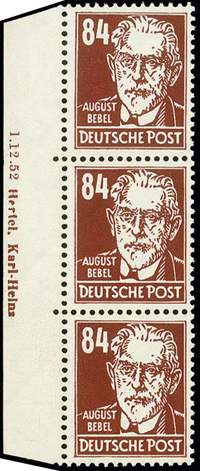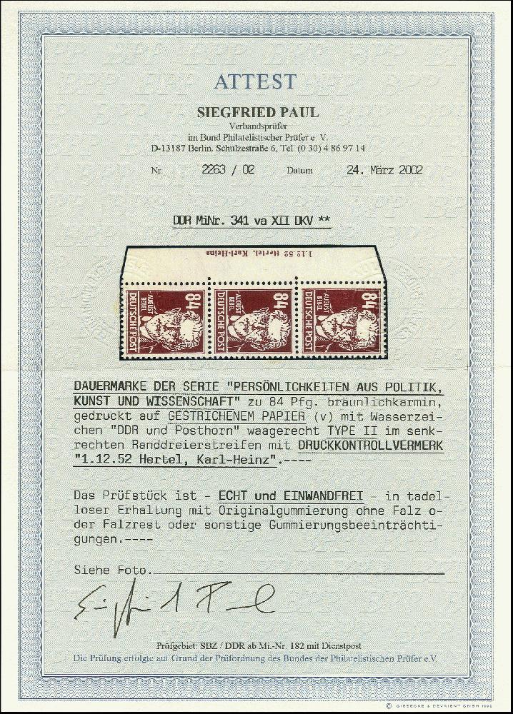 | Zusatzinformationen und Suchstichworte: | 368. Auktion Heinrich Köhler 26.-30. März 2019 Los 2575 84 Pfg. bräunlichkarmin auf gestrichenem Papier mit Wasserzeichen 2 XII, senkrechter Rand-3er-Streifen mit Druckkontrollvermerk "1.12.52 Hertel-Heinz", postfrisch mit üblichen Kalanderbügen, tadellos, unsigniert mit Fotoattest Paul BPP (2002) (Mi. 1.000,-) Zuschlag 750,00 EUR |