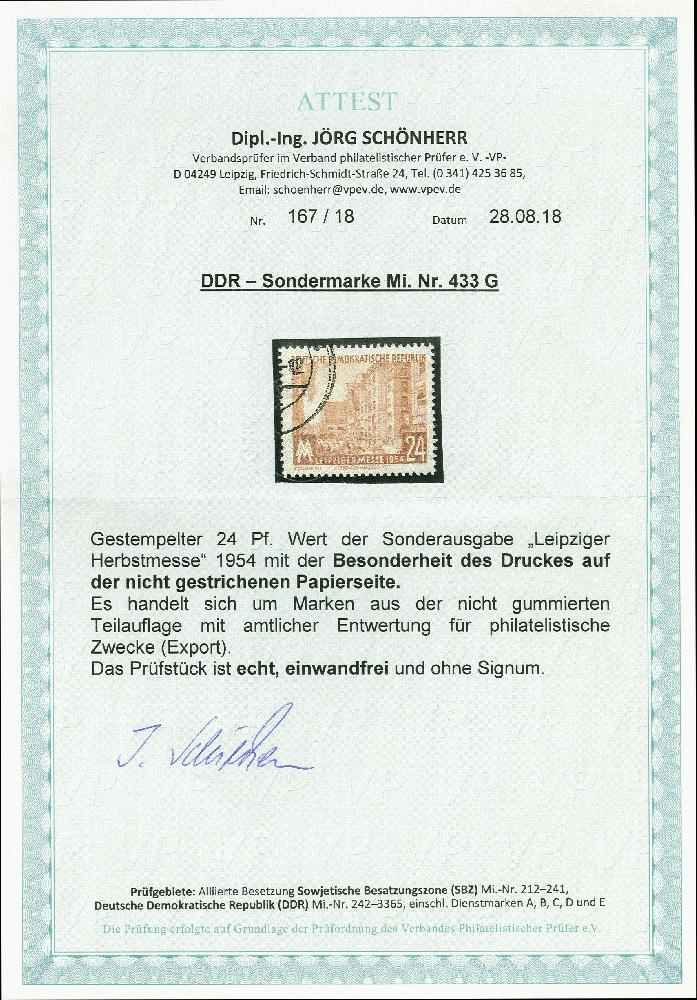| Zusatzinformationen und Suchstichworte: | 368. Auktion Heinrich Köhler 26.-30. März 2019 Los 2585 1954, Leipziger Herbstmesse 24 Pfg. mit Druck auf der nicht gestrichenen Rückseite, mit Gefälligkeitsentwertung, tadellos, bisher ohne Bewertung, selten, Fotoattest Schönherr (2018) Ausruf 450,00 EUR |