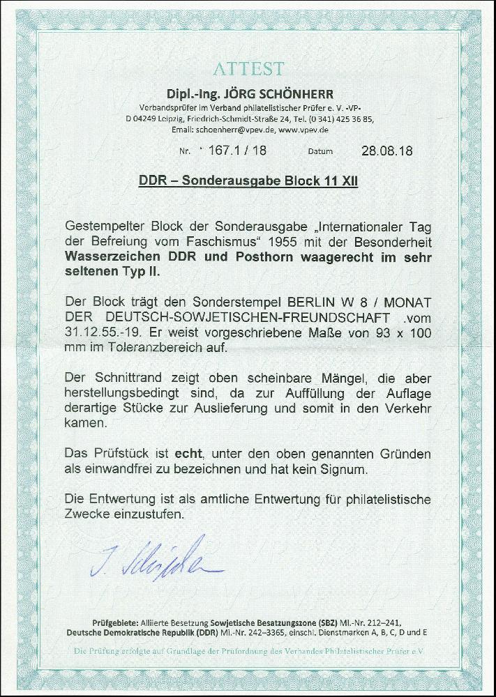 | Zusatzinformationen und Suchstichworte: | 368. Auktion Heinrich Köhler 26.-30. März 2019 Los 2593 1955, Internationaler Tag der Befreiung vom Faschismus-Block mit Wasserzeichen 2 XII, sauber gestempelt mit SST vom 31.12.55, laut ausführlichem Fotoattest Schönherr (2018) sind die oberen Randfehler herstellungsbedingt, sehr seltene Wasserzeichenabart, bisher nur postfrisch bewertet Ausruf 1.800,00 EUR |