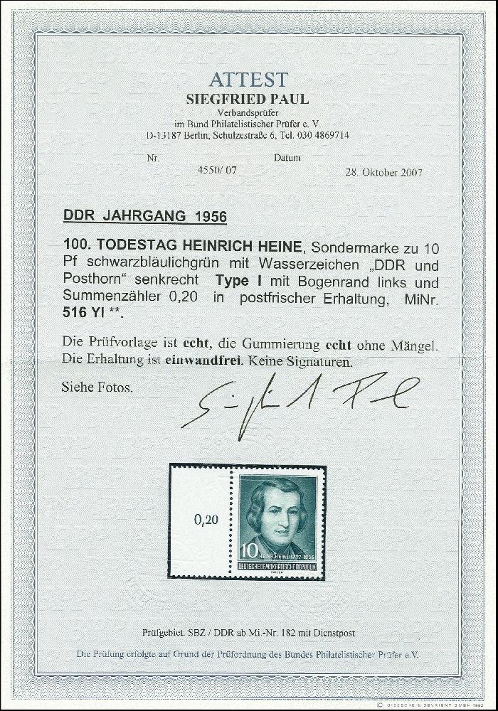 | Zusatzinformationen und Suchstichworte: | 368. Auktion Heinrich Köhler 26.-30. März 2019 Los 2598 Heinrich Heine 10 Pfg. mit Wasserzeichen 2 YI, Randstück, postfrisch, tadellos, unsigniert mit Fotoattest Paul BPP (2007) (Mi. 2.700,-) Zuschlag 700,00 EUR |