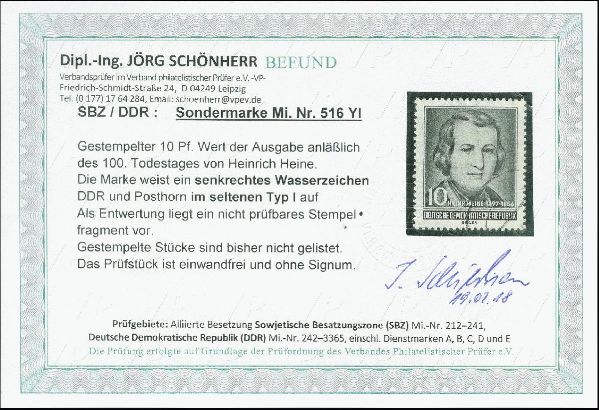 | Zusatzinformationen und Suchstichworte: | 368. Auktion Heinrich Köhler 26.-30. März 2019 Los 2599 1956, Heinrich Heine 10 Pfg. mit Wasserzeichen 2 YI und nicht prüfbarer Entwertung, sonst tadellos, selten, Fotobefund Schönherr (2018) Ausruf 400,00 EUR |