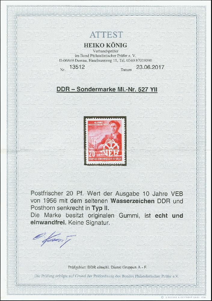 | Zusatzinformationen und Suchstichworte: | 368. Auktion Heinrich Köhler 26.-30. März 2019 Los 2601 1956, 10 Jahre VEB 20 Pfg. mit Wasserzeichen 2 YII, postfrisch, tadellos, Fotoattest König BPP (2017) (Mi. 850,-) Ausruf 160,00 EUR |