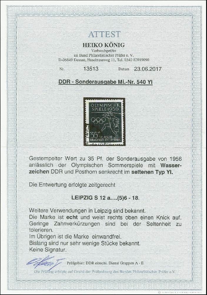| Zusatzinformationen und Suchstichworte: | 368. Auktion Heinrich Köhler 26.-30. März 2019 Los 2602 1956, Olympische Sommerspiele Melbourne 35 Pfg. mit Wasserzeichen 2 YI und zeitgerechter Entwertung mit Stempel "LEIPZIG S12...", Marke mit Eckknick und geringe Zahnverkürzungen, sehr selten, bisher sind nur wenige Exemplare bekannt, Fotoattest König BPP (2017) Ausruf 800,00 EUR |