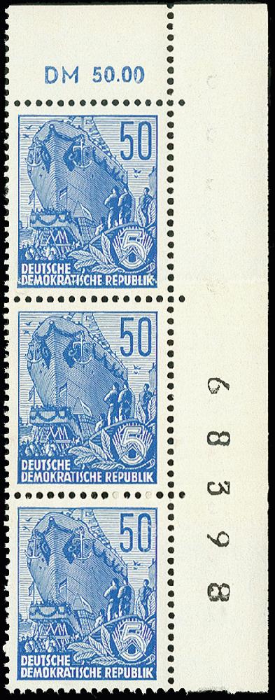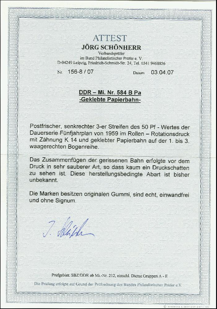 | Zusatzinformationen und Suchstichworte: | 368. Auktion Heinrich Köhler 26.-30. März 2019 Los 2605 1957, Fünfjahrplan 50 Pfg. im senkrechten 3er-Streifen aus der rechten oberen Bogenecke mit Abart "Druck auf geklebter Papierbahn" über alle drei Marken gehend, postfrisch, tadellos, sehr selten, unsign. mit Fotoattest Schönherr BPP (2007) Zuschlag 300,00 EUR |