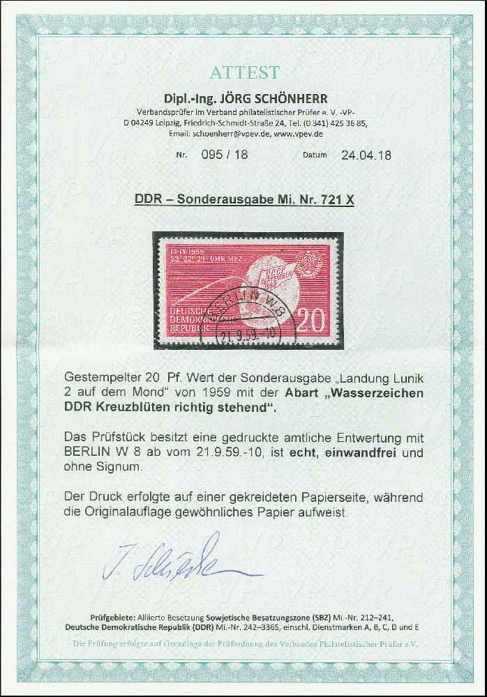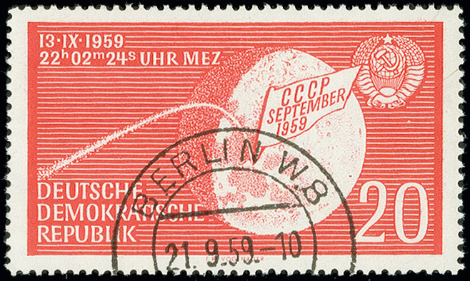 | Zusatzinformationen und Suchstichworte: | 368. Auktion Heinrich Köhler 26.-30. März 2019 Los 2606 1959, Landung der sowjetischen Weltraumrakete Lunik 2 auf dem Mond 20 Pfg. auf gestrichenem Papier mit Wasserzeichen 3 X und Gefälligkeitsentwertung, tadellos, Fotoattest Schönherr (2018) Ausruf 350,00 EUR |