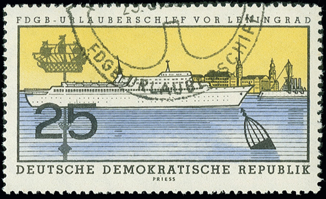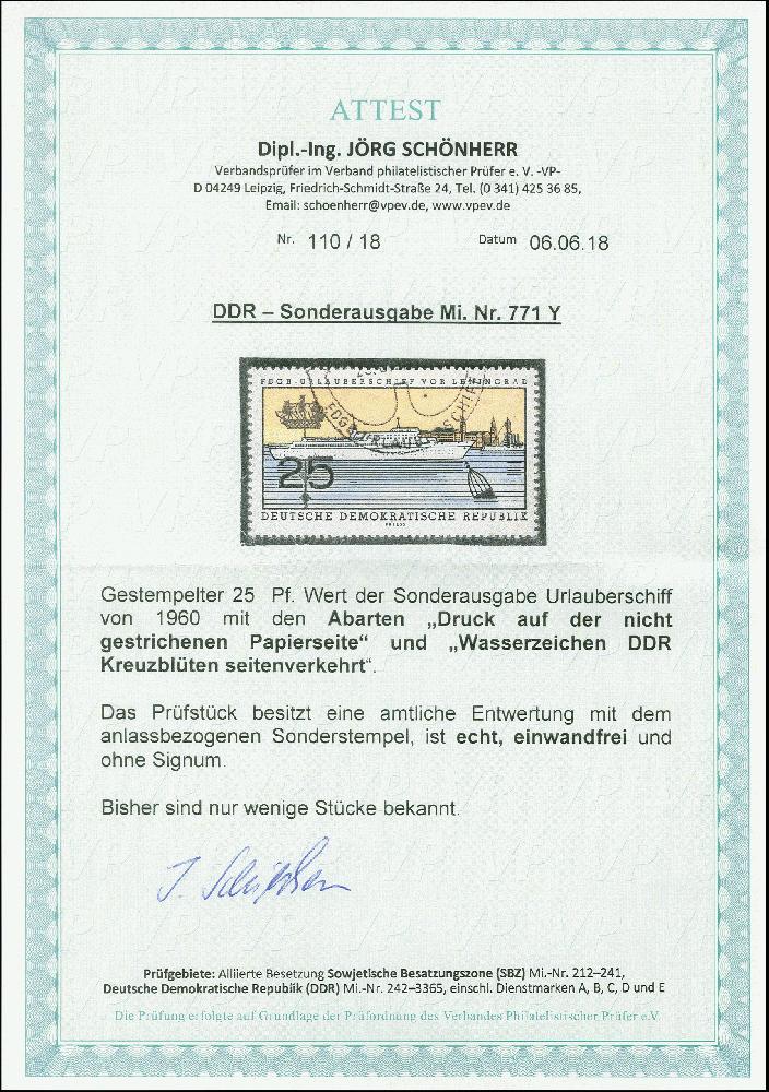 | Zusatzinformationen und Suchstichworte: | 368. Auktion Heinrich Köhler 26.-30. März 2019 Los 2607 1960, Stappelauf des FDGB-Urlauberschiffs MS Fritz Heckert 25 Pfg. mit Wasserzeichen 3 Y und Gefälligkeitsentwertung, tadellos, sehr seltene Marke, Fotoattest Schönherr (2018) (Mi. 1.800,-) Ausruf 450,00 EUR |