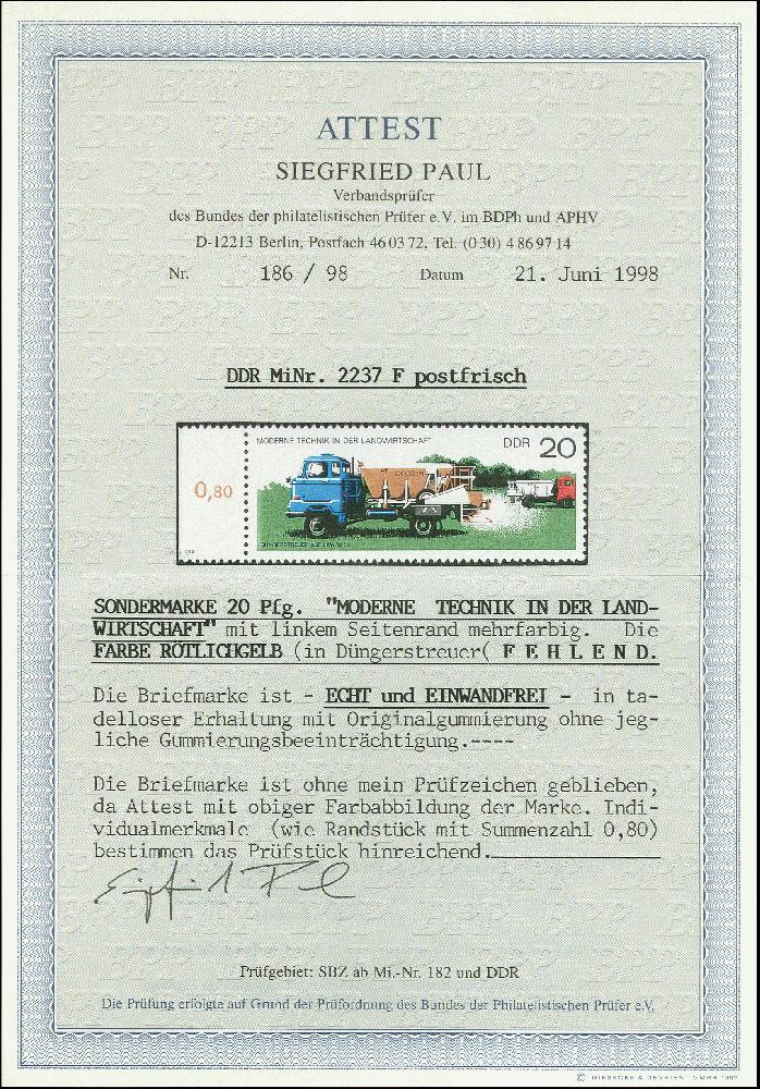 | Zusatzinformationen und Suchstichworte: | 368. Auktion Heinrich Köhler 26.-30. März 2019 Los 2610 1977, Moderne Technik in der Landwirtschaft 20 Pfg. mit Abart "Farbe Rötlichgelb (im Düngerstreuer) fehlend", Randstück, postfrisch, tadellos, unsigniert mit Fotoattest Paul BPP (1998) (Mi. 700,-) Zuschlag 280,00 EUR |