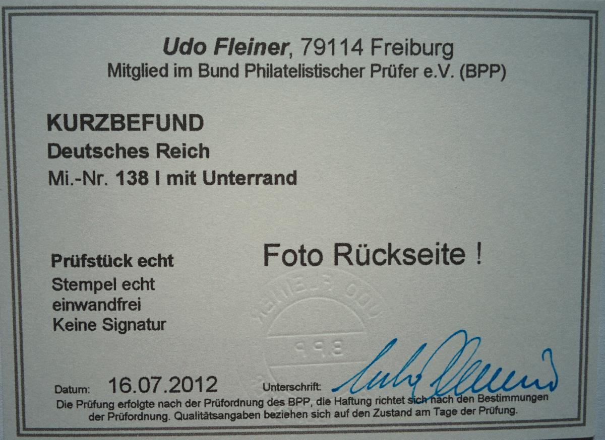 | Prüfer: | Fleiner, Udo (BPP (Bund Philatelistischer Prüfer)) |