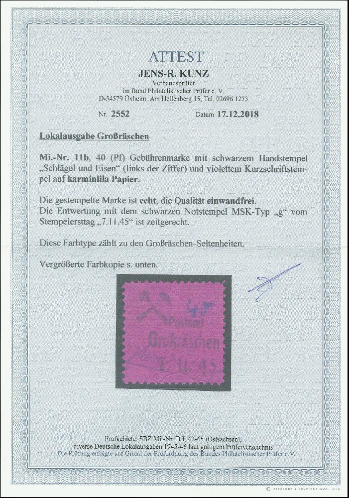 | Zusatzinformationen und Suchstichworte: | 368. Auktion Heinrich Köhler 26.-30. März 2019 Los 2287 40 Pfg. karminlila mit Notstempel "Postamt Großräschen 7.11.45", tadellos, seltene Farbe, Fotoattest Kunz BPP (2018) Ausruf 200,00 EUR |