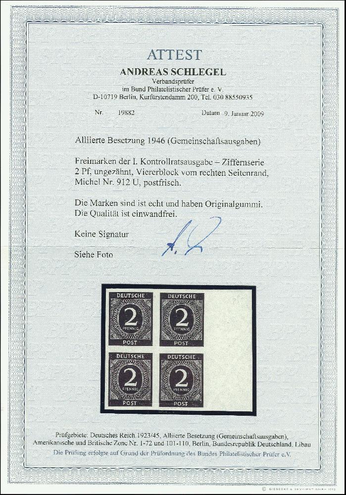 | Zusatzinformationen und Suchstichworte: | 368. Auktion Heinrich Köhler 26.-30. März 2019 Los 2292 2 Pfg. ungezähnt im Randviererblock, postfrisch mit Kalanderbügen, sonst tadellos, unsigniert mit Fotoattest A. Schlegel BPP (Mi. 1.200,- +) Ausruf 250,00 EUR |