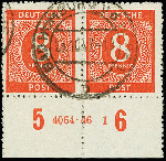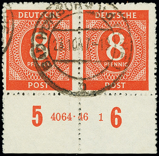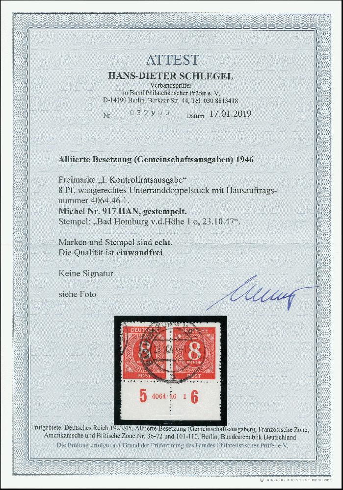 | Zusatzinformationen und Suchstichworte: | 368. Auktion Heinrich Köhler 26.-30. März 2019 Los 2298 8 Pfg. im waagerechten Unterrandpaar mit HAN "4064.46 1", sauber gestempelt, tadellos, sehr selten, Fotoattest D. Schlegel BPP (2019) (Mi. 1.000,-) Ausruf 250,00 EUR |