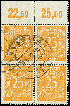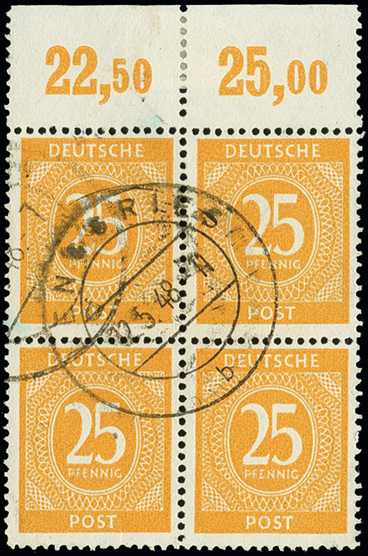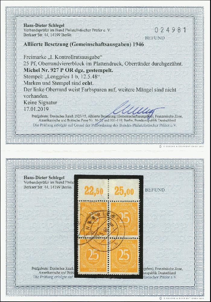 | Zusatzinformationen und Suchstichworte: | 368. Auktion Heinrich Köhler 26.-30. März 2019 Los 2314 25 Pfg. gelb im Viererblock mit dgz. Plattendruck-Oberrändern, sauber gestempelt, oben senkrecht angetrennt und links im Oberrand leichte Farbspuren, sonst tadellos, Fotobefund D. Schlegel BPP (2019) (Mi. 600,-+) Ausruf 150,00 EUR |