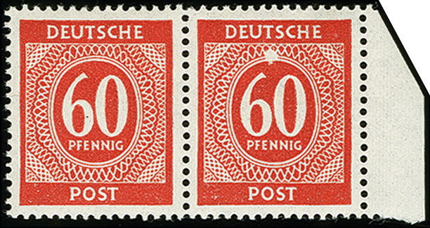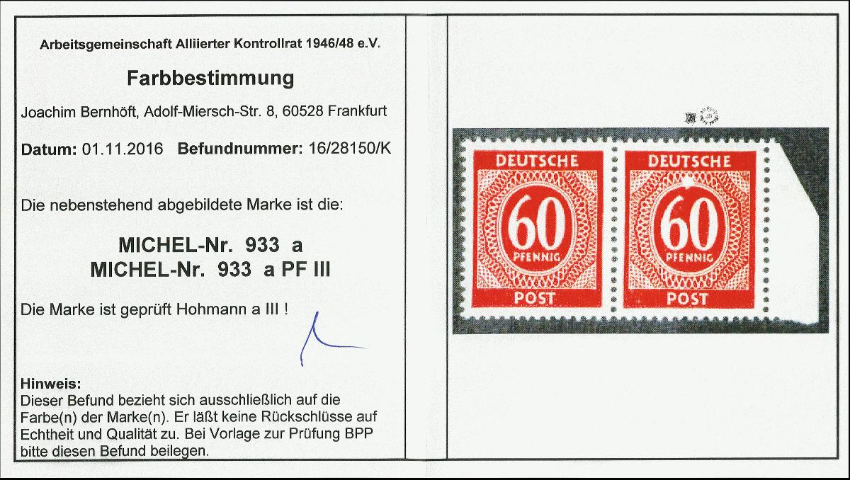 | Zusatzinformationen und Suchstichworte: | 368. Auktion Heinrich Köhler 26.-30. März 2019 Los 2320 60 Pfg. rot im waagerechten Randpaar, rechte Marke mit Plattenfehler "großer weißer Fleck in Ovallinien und im Netz unter TS in DEUTSCHE" (Feld 80), postfrisch, tadellos, sign. Hohmann BPP und Fotobefund Bernhöft (2016) (Mi. 500,-) Zuschlag 320,00 EUR |