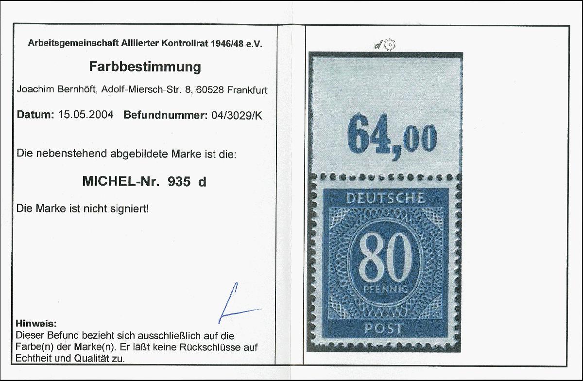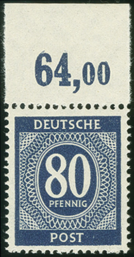 | Zusatzinformationen und Suchstichworte: | 368. Auktion Heinrich Köhler 26.-30. März 2019 Los 2325 80 Pfg. dunkelviolettultramarin mit ndgz. Plattendruckoberrand, postfrisch mit Kalanderbug, sonst tadellos, sehr seltene Farbe, unsigniert mit Fotobefund Bernhöft (2004) (Mi. 2.600,-) Zuschlag 500,00 EUR |