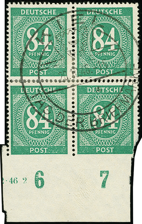 | Zusatzinformationen und Suchstichworte: | 368. Auktion Heinrich Köhler 26.-30. März 2019 Los 2330 84 Pfg. im Unterrandviererblock, die beiden unteren Marken mit Abart "unten ungezähnt" und Teil der HAN, gestepelt, Zähnung angetrennt, rechte untere Marke rechts mit Ausriss und Unterrand schmal geschnitten, trotz der Einschränkungen optisch anspechende Einheit mit dieser seltenen Abart, Fotoattest D. Schlegel BPP (2019) Ausruf 500,00 EUR |