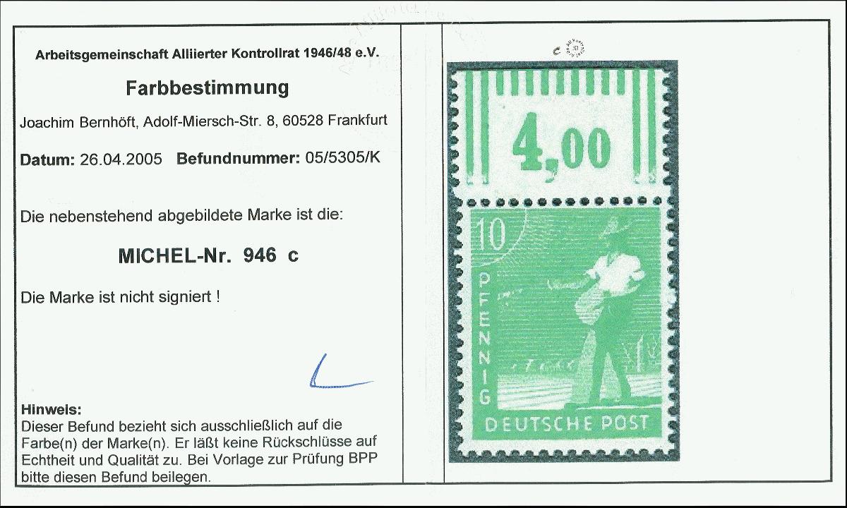 | Zusatzinformationen und Suchstichworte: | 368. Auktion Heinrich Köhler 26.-30. März 2019 Los 2341 10 Pfg. dunkelgelblichgrün mit Walzdruckoberrand, postfrisch, tadellos, unsigniert mit Fotobefund Bernhöft (2005) (Mi. 500,-) Ausruf 100,00 EUR |