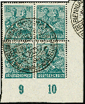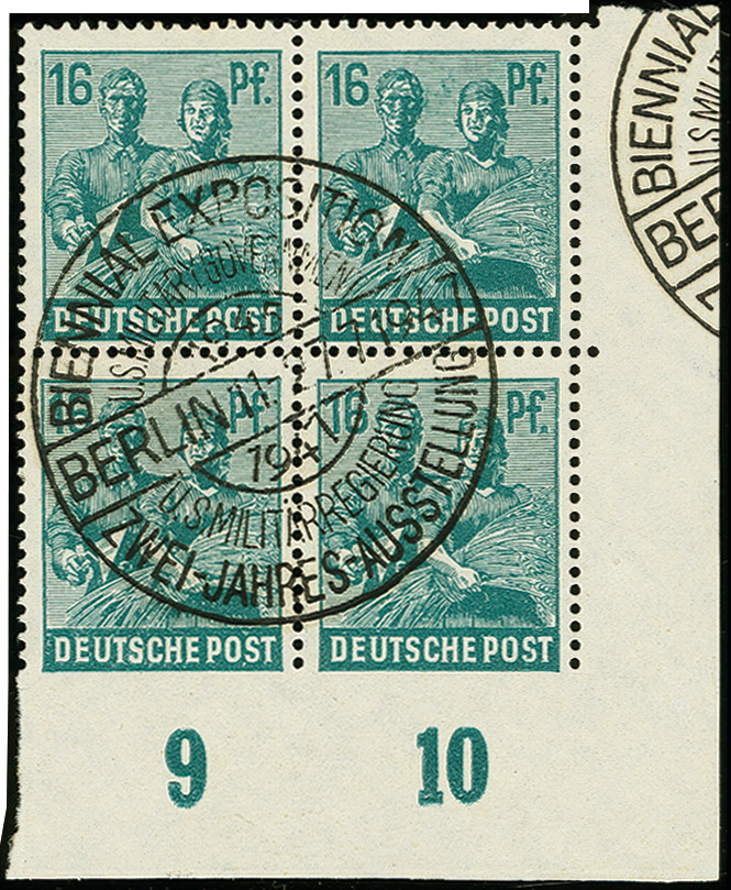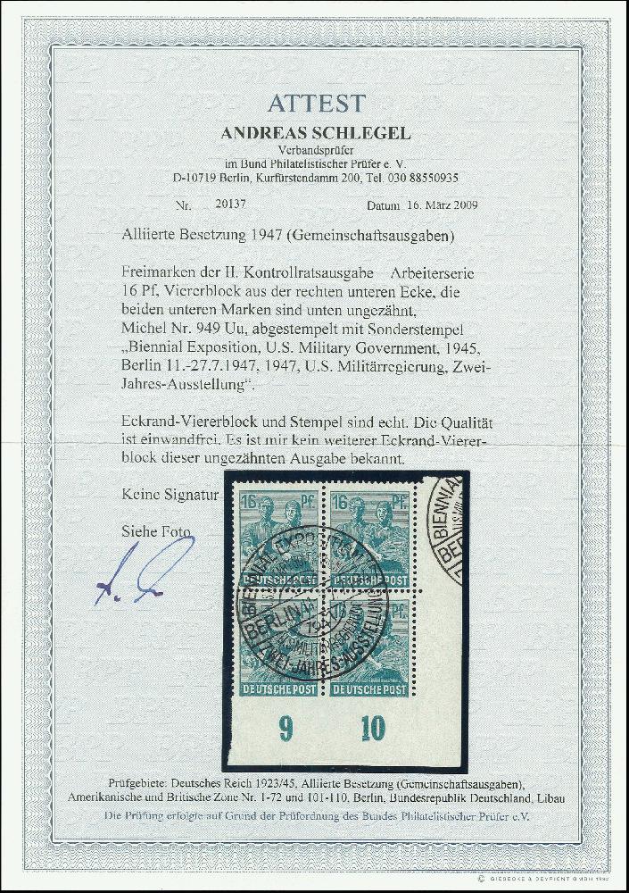 | Zusatzinformationen und Suchstichworte: | 368. Auktion Heinrich Köhler 26.-30. März 2019 Los 2348 16 Pfg. unten ungezähnt, zwei Stück im Viererblock aus der rechten unteren Bogenecke mit zwei Normalmarken, sauber gestempelt mit SST "BERLIN 11 27.7.1947", tadellos, laut ausführlichem Fotoattest A. Schlegel BPP (2009) ist kein weiterer Eckrandviererblock mit dieser Abart bekannt Zuschlag 900,00 EUR |