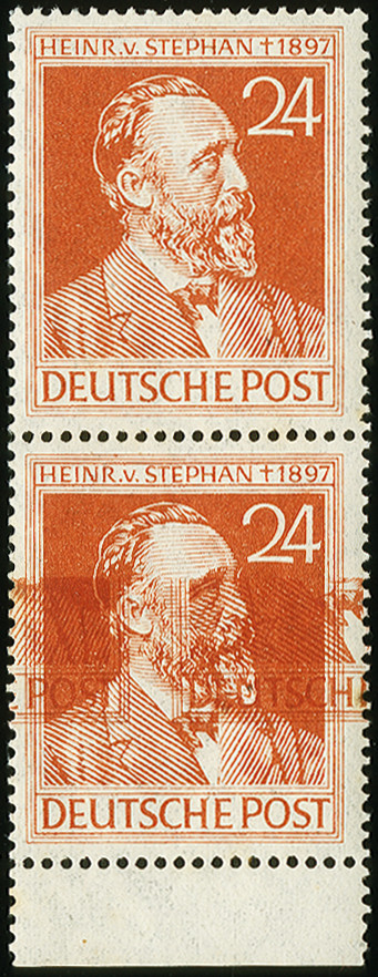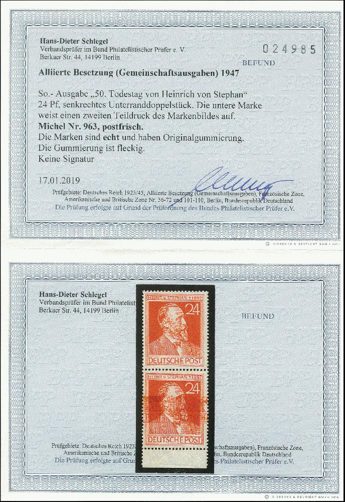 | Zusatzinformationen und Suchstichworte: | 368. Auktion Heinrich Köhler 26.-30. März 2019 Los 2362 1947, Heinrich von Stephan 24 Pfg. im senkrechten Unterrandpaar, untere Marke mit zweitem Teildruck des Markenbildes, postrisch, rückseitig mit Gelbflecken, dekorative und seltene Abart, Fotobefund D. Schlegel BPP (2019) Ausruf 150,00 EUR |
