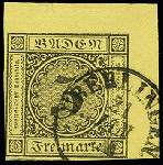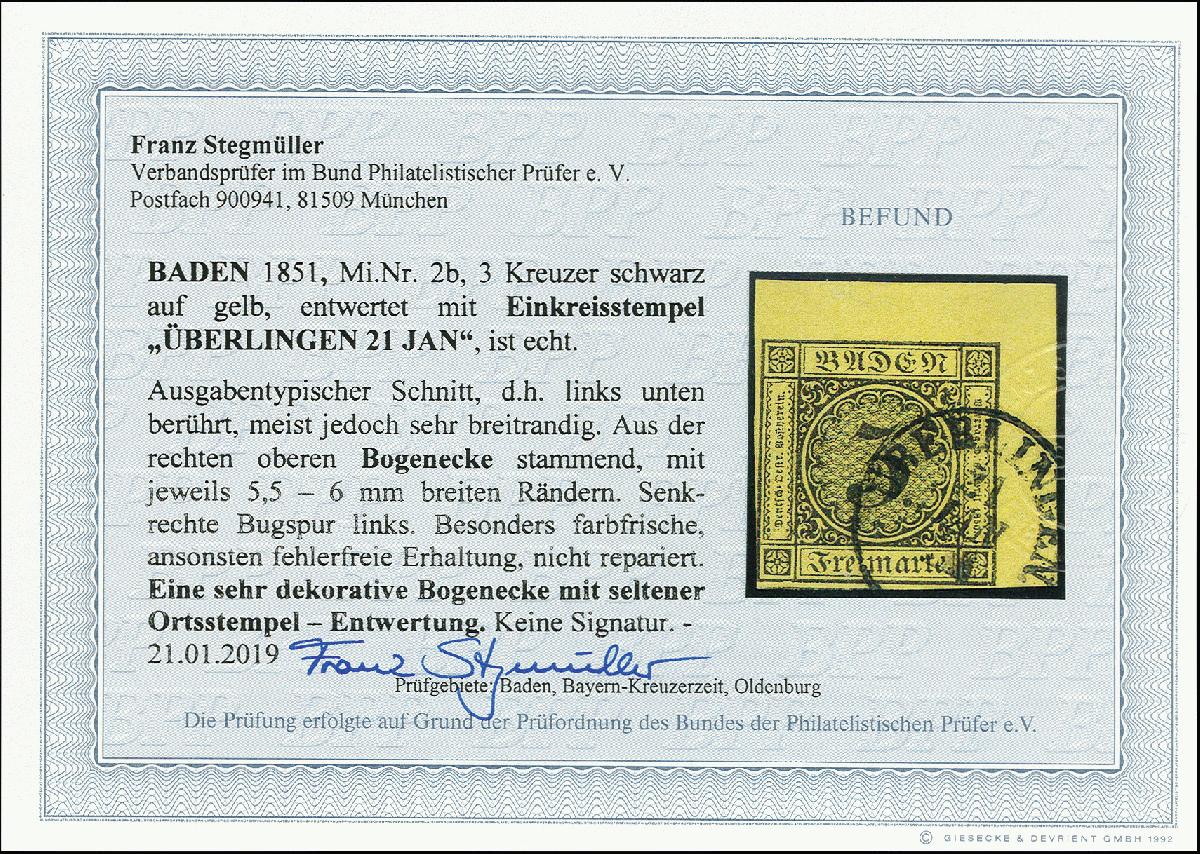 | Zusatzinformationen und Suchstichworte: | 368. Auktion Heinrich Köhler 26.-30. März 2019 Los 3240 3 Kr. auf gelb, links unten leicht berührt, sonst breit- bis überrandig aus der rechten oberen Bogenecke mit ca. 5,5-6 mm Bogenrändern, sehr schön entwertet durch EKr. "ÜBERLINGEN 21 JAN", leichte senkrechte Bugspur links, sonst einwandfrei, sehr attraktiv und mit der Ortsstempelentwertung besonders selten, Fotobefund Stegmüller BPP Zuschlag 200,00 EUR |