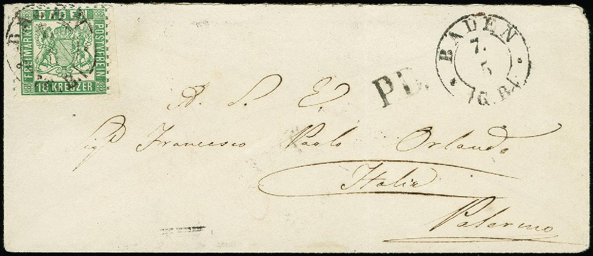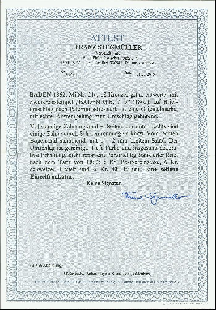 | Zusatzinformationen und Suchstichworte: | 368. Auktion Heinrich Köhler 26.-30. März 2019 Los 3250 18 Kr. grün, farbfrisch und überwiegend gut gezähnt, nur unten rechts sind einige Zähne durch Scherentrennung verkürzt, rechts mit schmalem Bogenrand, mit sauber auf- und nebengesetztem DKr. "BADEN G.W. 7.5" (1865) auf kleiner Briefhülle über die Schweiz nach Palermo, diverse Transit- und Ankunftsstempel einschließlich "SCHIFFSBUREAU Nr.2 LUZERN", das Kuvert leichte Faltung außerhalb der Frankatur, eine attraktive und seltene Einzelfrankatur, Fotoattest Stegmüller BPP (2019) Zuschlag 1.200,00 EUR |
