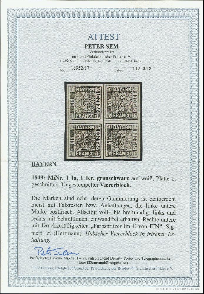 | Zusatzinformationen und Suchstichworte: | 368. Auktion Heinrich Köhler 26.-30. März 2019 Los 3265 1 Kr. grauschwarz im 4er-Block, die rechte untere Marke mit Druckzufälligkeit (Farbspritzer im E von EIN), ungebraucht mit Originalgummi, die linke untere Marke postfrisch, Kabinett, private Signatur und sign. Herrmann, Fotoattest Sem BPP (2018) Zuschlag 2.800,00 EUR |
