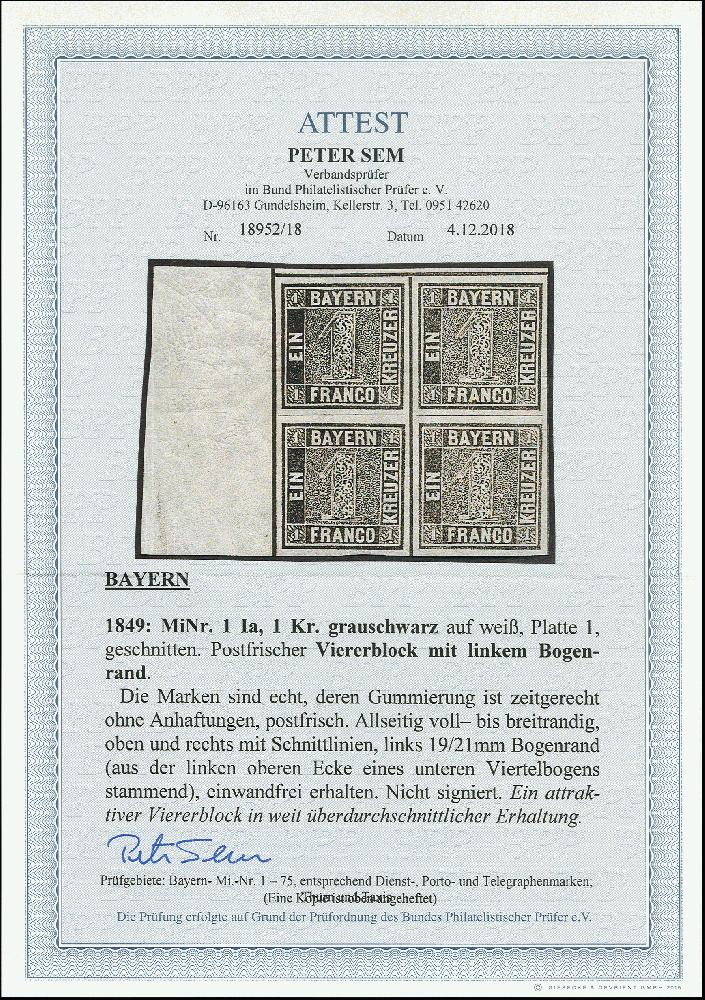 | Zusatzinformationen und Suchstichworte: | 368. Auktion Heinrich Köhler 26.-30. März 2019 Los 3266 1 Kr. grauschwarz im 4er-Block, allseits breitrandig, oben mit vollständiger Trennungslinie und links mit 19/21 mm Bogenrand, postfrisch in tadelloser Erhaltung, Fotoattest Sem BPP (2018) Zuschlag 4.200,00 EUR |