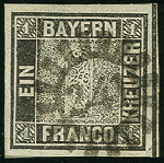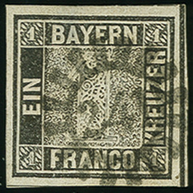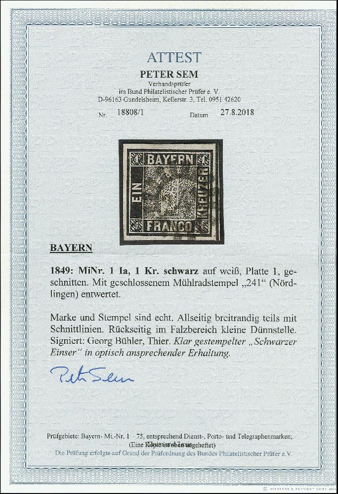 | Zusatzinformationen und Suchstichworte: | 368. Auktion Heinrich Köhler 26.-30. März 2019 Los 3284 1 Kr. schwarz, allseits breit- bis überrandig, sauber entwertet durch gMR "241" NÖRDLINGEN, rückseitig minimal falzhell, mehrfach sign. und Fotoattest Sem BPP (2018) Zuschlag 950,00 EUR |