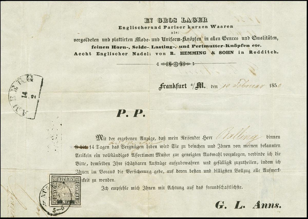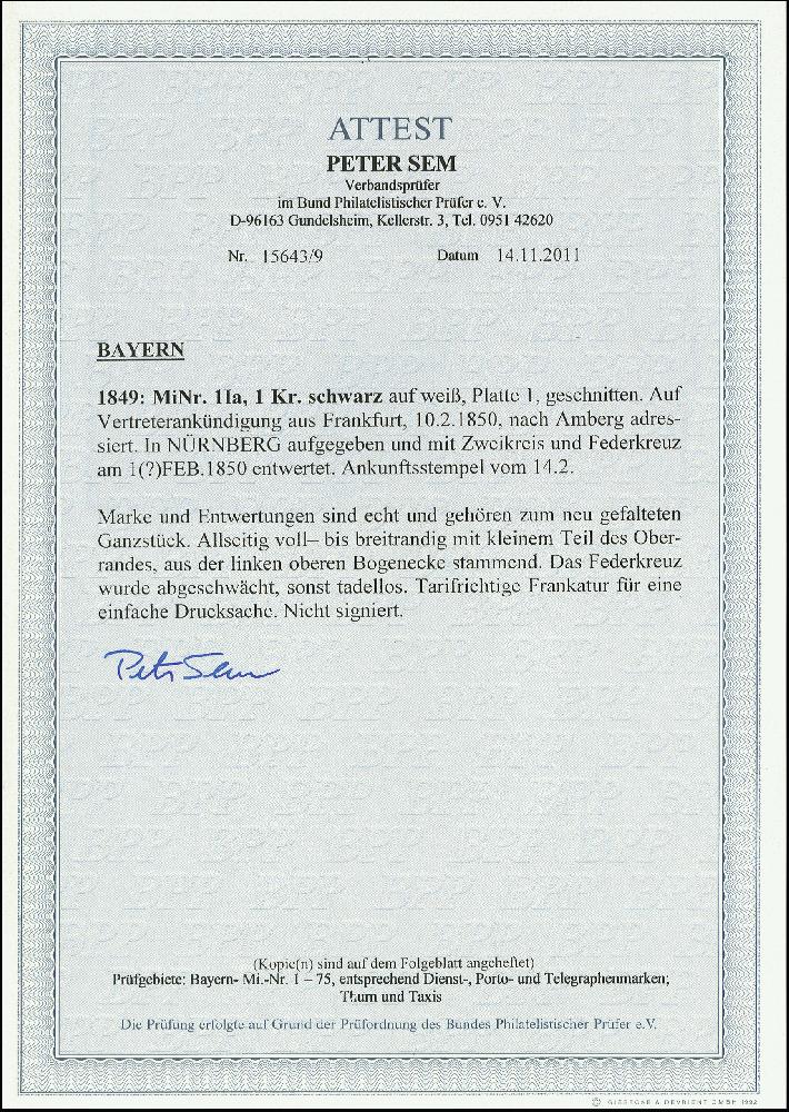 | Zusatzinformationen und Suchstichworte: | 368. Auktion Heinrich Köhler 26.-30. März 2019 Los 3288 1 Kr. schwarz, farbfrisch und allseits voll- bis meist breitrandig mit Zwischenlinien an 3 Seiten und oben schmalem Oberrand, aus der linken oberen Bogenecke stammend, mit DKr. "NÜRNBERG 1.. FEB. 1850" auf neugefalteter Drucksache (Vertreterankündigung) datiert "Frankfurt a/M. den 10 Februar 1850" nach Amberg mit Ankunftsstempel; ein zusätzliches Federkreuz auf der Marke abgeschwächt, sonst einwandfrei; ein dekoratives Stück, Fotoattest Sem BPP (2011) Zuschlag 1.900,00 EUR |