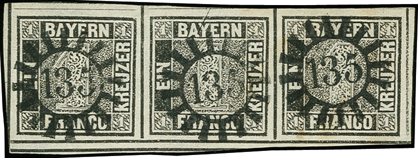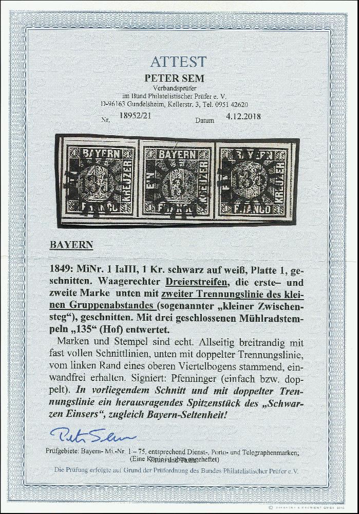 | Zusatzinformationen und Suchstichworte: | 368. Auktion Heinrich Köhler 26.-30. März 2019 Los 3290 1 Kr. schwarz im waagerechten 3er-Streifen, farbfrisch und allseits enorm breit- bis überrandig mit fast vollständigen Zwischenlinien, links oben Teil der Nachbarmarke und doppelter Trennungslinie unter den beiden linken Werten, sauber entwertet durch gMR "135" HOF, tadellos. Ein ganz außergewöhnlich schöner Streifen von großer Seltenheit, sign. Pfenninger und Fotoattest Sem BPP (2018) Zuschlag 18.000,00 EUR |