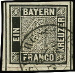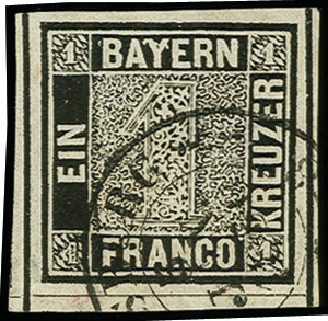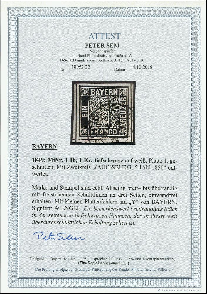 | Zusatzinformationen und Suchstichworte: | 368. Auktion Heinrich Köhler 26.-30. März 2019 Los 3292 1 Kr. tiefschwarz mit kleinem Plattenfehler am Y von BAYERN, allseits breit- bis überrandig, leicht und sauber entwertet durch DKr. von Augsburg, ein besonders schönes Stück in tadelloser Erhaltung, Fotoattest Sem BPP (2018) Zuschlag 2.800,00 EUR |