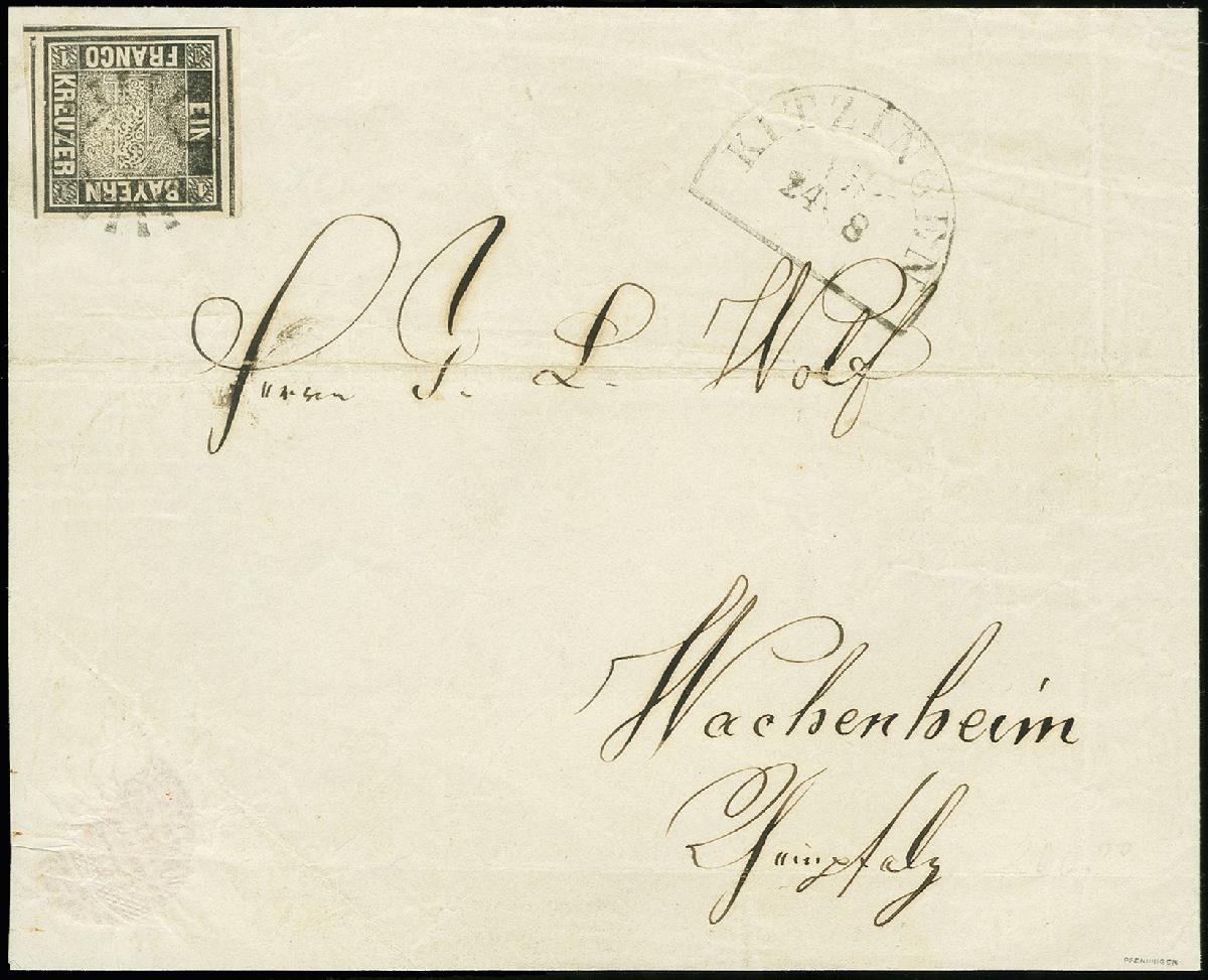 | Zusatzinformationen und Suchstichworte: | 368. Auktion Heinrich Köhler 26.-30. März 2019 Los 3298 1 Kr. schwarz, farbfrisch und breit- bis überrandig mit leicht aufgesetztem gMR "160" und nebengesetztem Halbkreisstempel "KITZINGEN 24/8" (1850) auf kpl. Drucksache nach Wachenheim in der Pfalz mit rückseitigem Durchgangsstempel von Dürkheim; leichte Faltungen außerhalb der Frankatur; ein schönes Stück in einwandfreier Erhaltung, sign. Pfenninger und Fotoattest Stegmüller BPP (2014) Zuschlag 2.800,00 EUR |