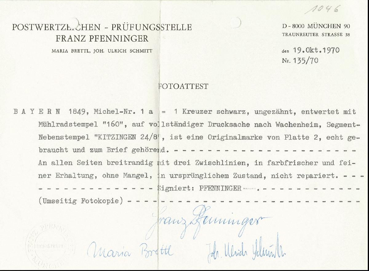 | Zusatzinformationen und Suchstichworte: | 368. Auktion Heinrich Köhler 26.-30. März 2019 Los 3298 1 Kr. schwarz, farbfrisch und breit- bis überrandig mit leicht aufgesetztem gMR "160" und nebengesetztem Halbkreisstempel "KITZINGEN 24/8" (1850) auf kpl. Drucksache nach Wachenheim in der Pfalz mit rückseitigem Durchgangsstempel von Dürkheim; leichte Faltungen außerhalb der Frankatur; ein schönes Stück in einwandfreier Erhaltung, sign. Pfenninger und Fotoattest Stegmüller BPP (2014) Zuschlag 2.800,00 EUR |
