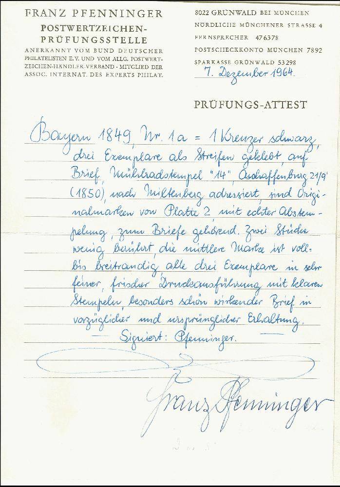 | Zusatzinformationen und Suchstichworte: | 368. Auktion Heinrich Köhler 26.-30. März 2019 Los 3300 1 Kr. schwarz, 3 Einzelwerte als Streifen geklebt, der mittlere voll- bis breitrandig, die links klebende unten rechts leicht berührt, sonst voll- bis überrandig, der rechts klebende Wert unten und links berührt, alle mit glasklarem gMR "14" auf kpl. Faltbrief mit sauber nebengesetztem Halbkreisstempel "ASCHAFFENBURG 21/9" (1850) nach Miltenberg; ein seltener und attraktiver Brief in völlig ursprünglicher Erhaltung, sign. Pfenninger mit Attest (1964) sowie Fotoattest Brettl BPP (1988) Zuschlag 5.500,00 EUR |