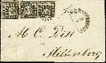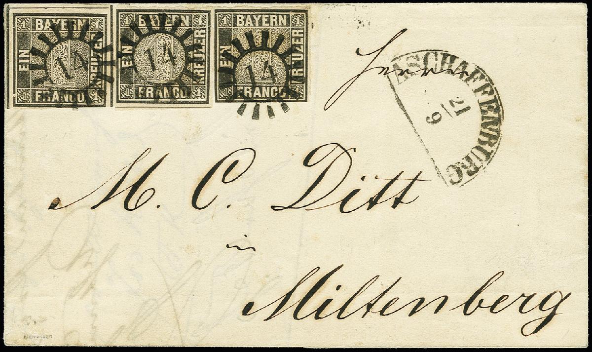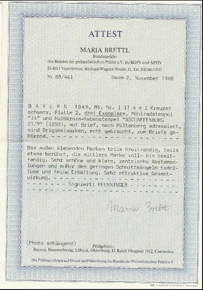 | Zusatzinformationen und Suchstichworte: | 368. Auktion Heinrich Köhler 26.-30. März 2019 Los 3300 1 Kr. schwarz, 3 Einzelwerte als Streifen geklebt, der mittlere voll- bis breitrandig, die links klebende unten rechts leicht berührt, sonst voll- bis überrandig, der rechts klebende Wert unten und links berührt, alle mit glasklarem gMR "14" auf kpl. Faltbrief mit sauber nebengesetztem Halbkreisstempel "ASCHAFFENBURG 21/9" (1850) nach Miltenberg; ein seltener und attraktiver Brief in völlig ursprünglicher Erhaltung, sign. Pfenninger mit Attest (1964) sowie Fotoattest Brettl BPP (1988) Zuschlag 5.500,00 EUR |