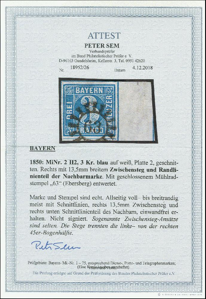 | Zusatzinformationen und Suchstichworte: | 368. Auktion Heinrich Köhler 26.-30. März 2019 Los 3305 3 Kr. blau, Platte 2, allseits voll- bis breitrandig, rechts mit 13,5 mm Zwischensteg und rechts unten Schnittlinienteil der Nachbarmarke, sauber entwertet durch gMR "63" EBERSBERG, Pracht, Fotoattest Sem BPP (2018) Zuschlag 260,00 EUR |