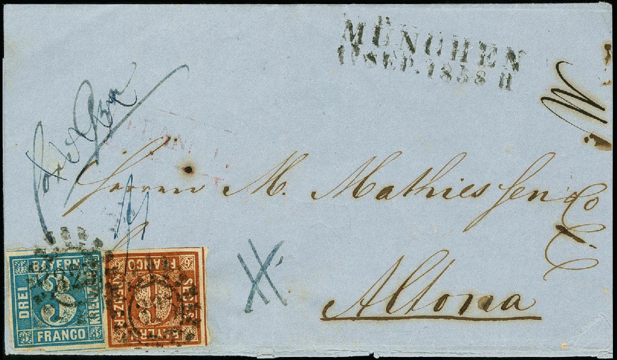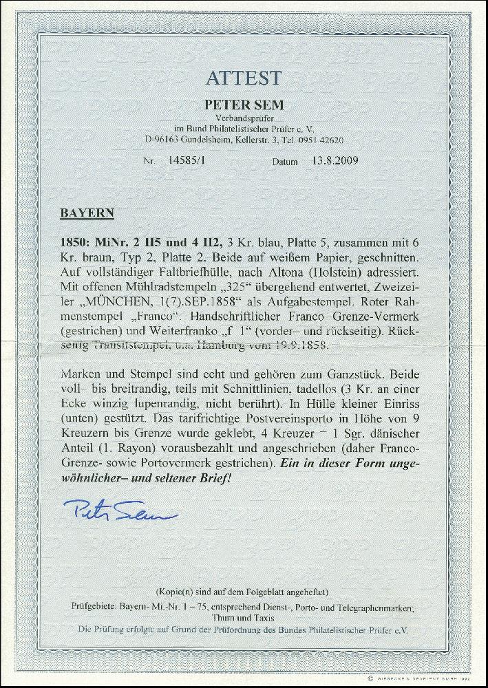 | Zusatzinformationen und Suchstichworte: | 368. Auktion Heinrich Köhler 26.-30. März 2019 Los 3308 3 Kr. blau, Platte 5 und 6 Kr. braun, beide voll- bis breitrandig mit oMR "325" und nebengesetztem L2 "MÜNCHEN 1.. SEP. 1858" auf Briefhülle nach Altona im dänischen Holstein. Der Brief war mit 13 Kr. vollständig bezahlt, jedoch nur das Postvereinsporto verklebt, 4 Kr. Auslandsanteil (= 1 Sgr.) war bezahlt und vorder- und rückseitig vermerkt. Ein kleiner Einriß in der Hülle unten verklebt, sonst gute Erhaltung; ein sehr seltener Brief mit 'geteiltem Franco', Fotoattest Sem BPP (2009) Ausruf 800,00 EUR |
