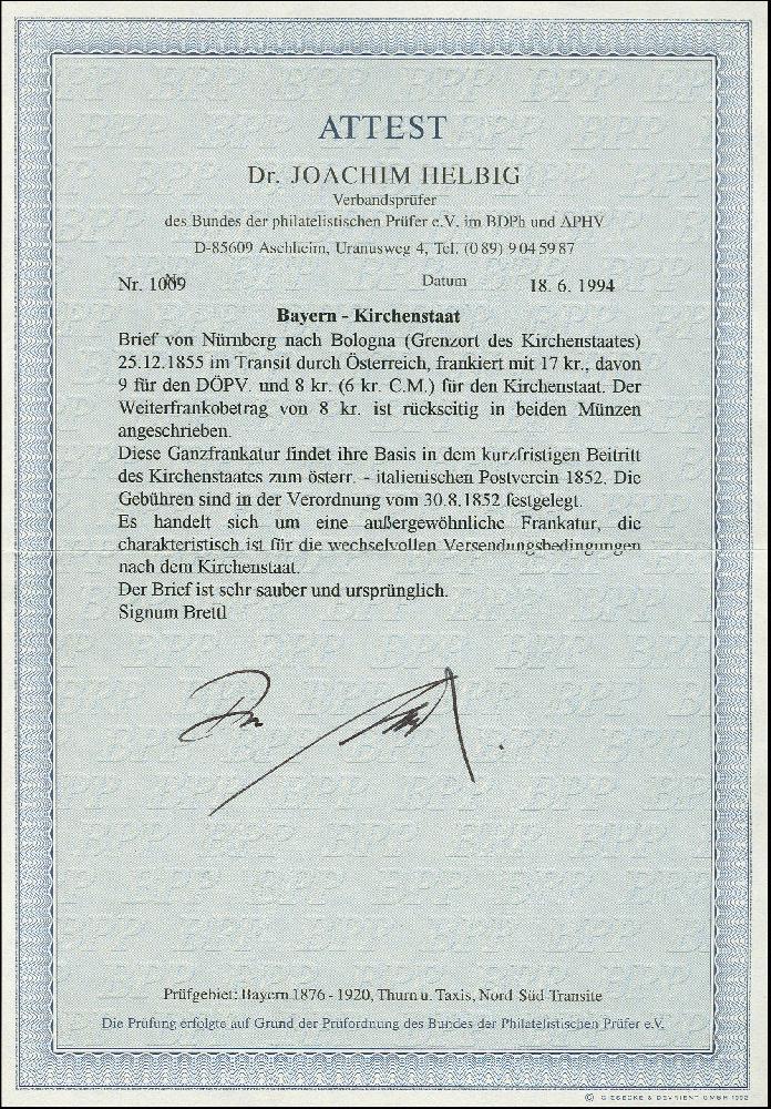 | Zusatzinformationen und Suchstichworte: | 368. Auktion Heinrich Köhler 26.-30. März 2019 Los 3311 1 Kreuzer dunkelrosa, 2 Einzelwerte mit 6 Kreuzer braun und 9 Kreuzer gelbgrün, 2 Werte einseitig berührt, sonst alle voll- bis breitrandig und farbfrisch mit gMR "243" und nebengesetztem DKr. "NÜRNBERG 25 DEC 1855" auf Briefhülle mit großem Teil des Inhaltes nach Bologna im Kirchenstaat; das Weiterfranko in Höhe von 8 Kreuzern rückseitig in beiden Münzen vermerkt, Fotoattest Dr. Helbig BPP (1994) Zuschlag 450,00 EUR |