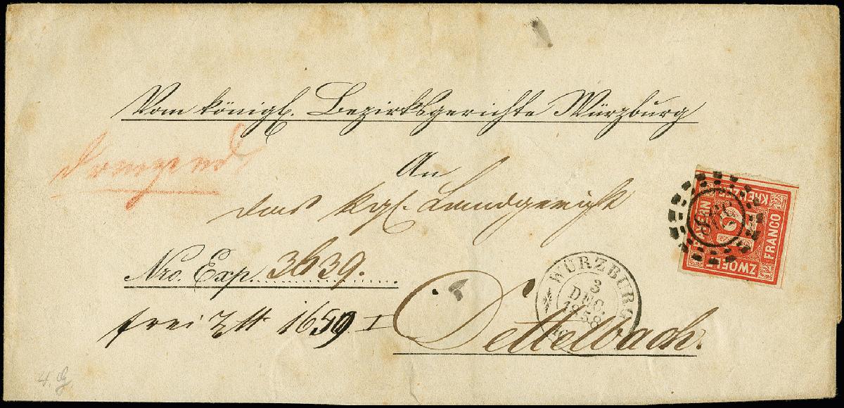 | Zusatzinformationen und Suchstichworte: | 368. Auktion Heinrich Köhler 26.-30. März 2019 Los 3316 12 Kr. rot, voll- bis breitrandig mit vollen Zwischenlinien an 2 Seiten, mit klarem oMR "598" und nebengesetztem DKr. "WÜRZBURG 3 DEC. 1858" auf Briefhülle der 4. Gewichtsstufe nach Dettelbach mit handschriftlichem "dringend"; leichte Patina, sonst einwandfrei; eine seltene innerbayerische Frankatur, Fotoattest Brettl BPP (2008) Zuschlag 280,00 EUR |